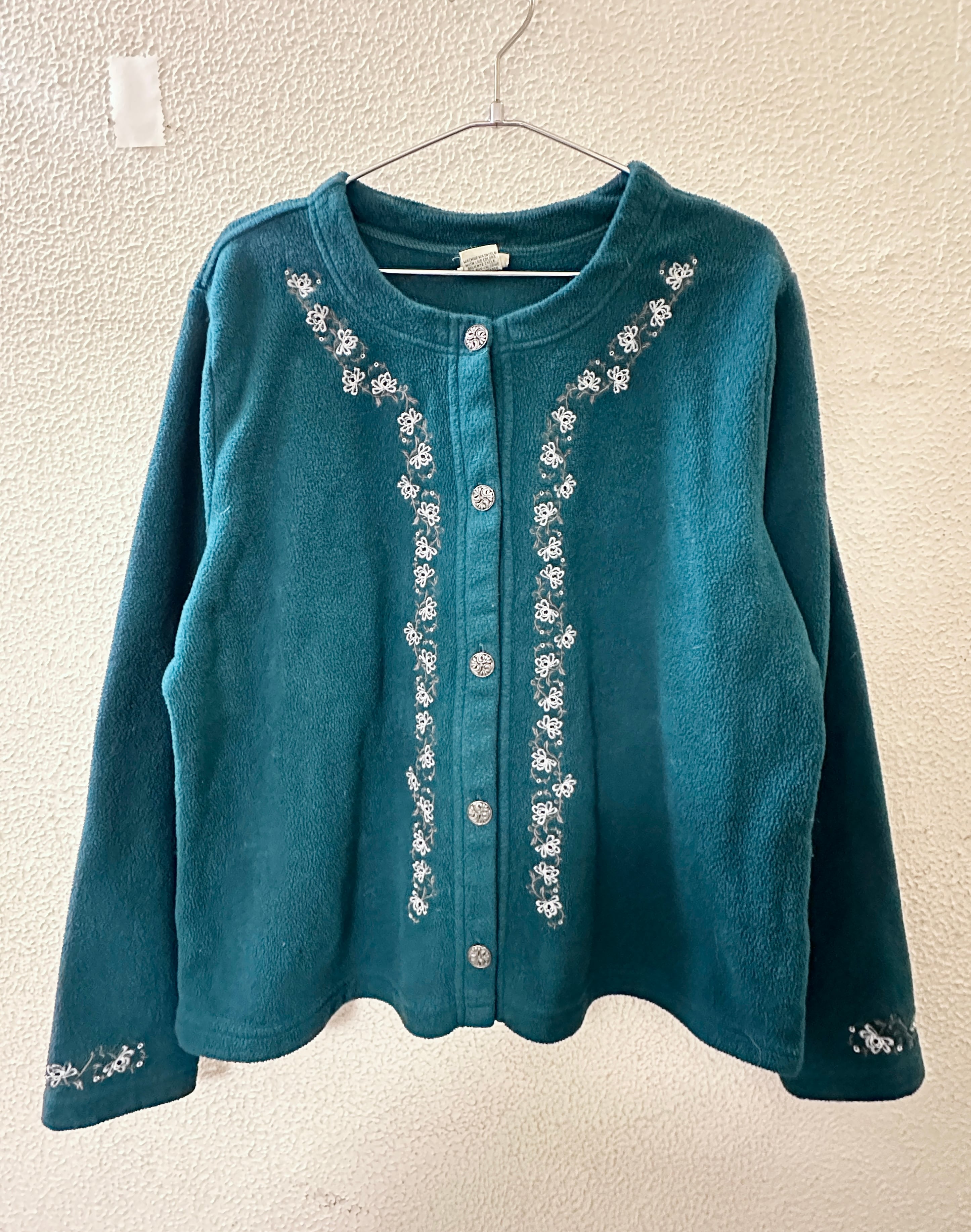 エルエルビーン 長袖フリースカーディガン 緑 花刺繍 レディース
