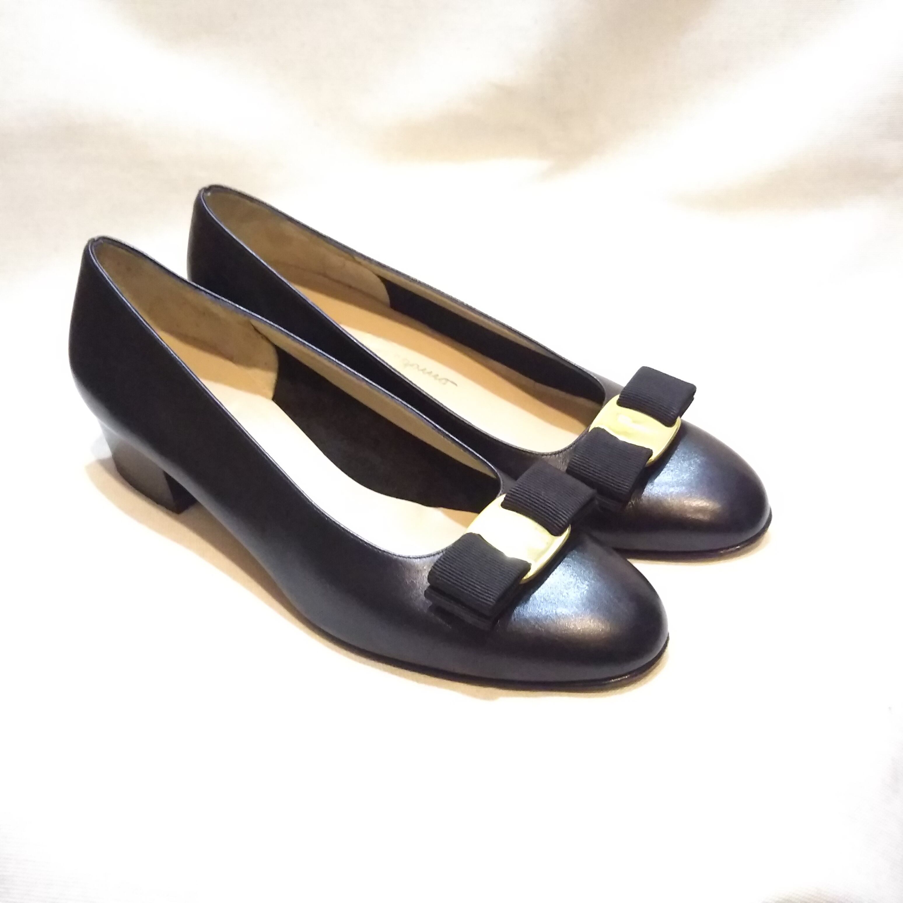 フェラガモ パンプス 黒色 リボン レザー Salvatore Ferragamo