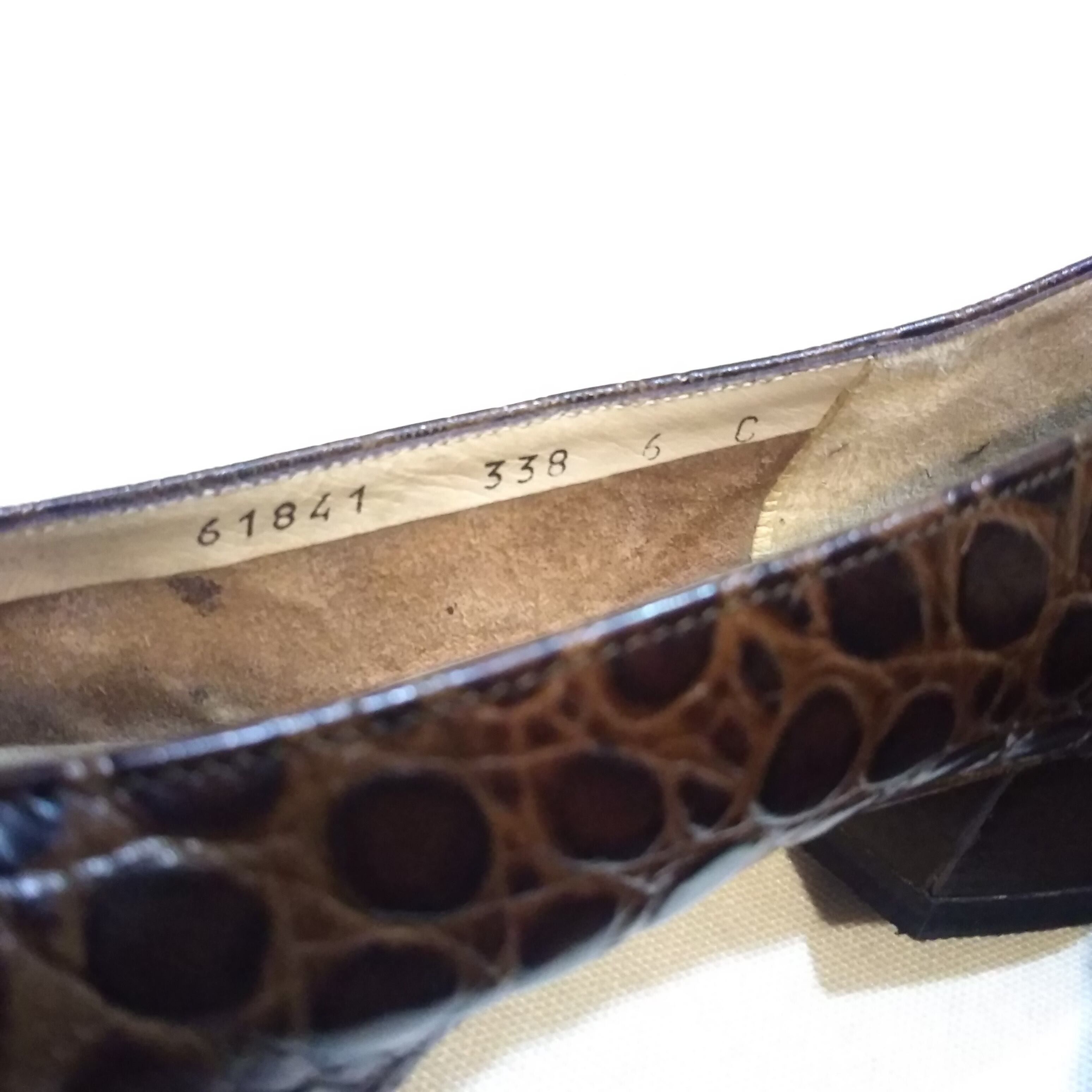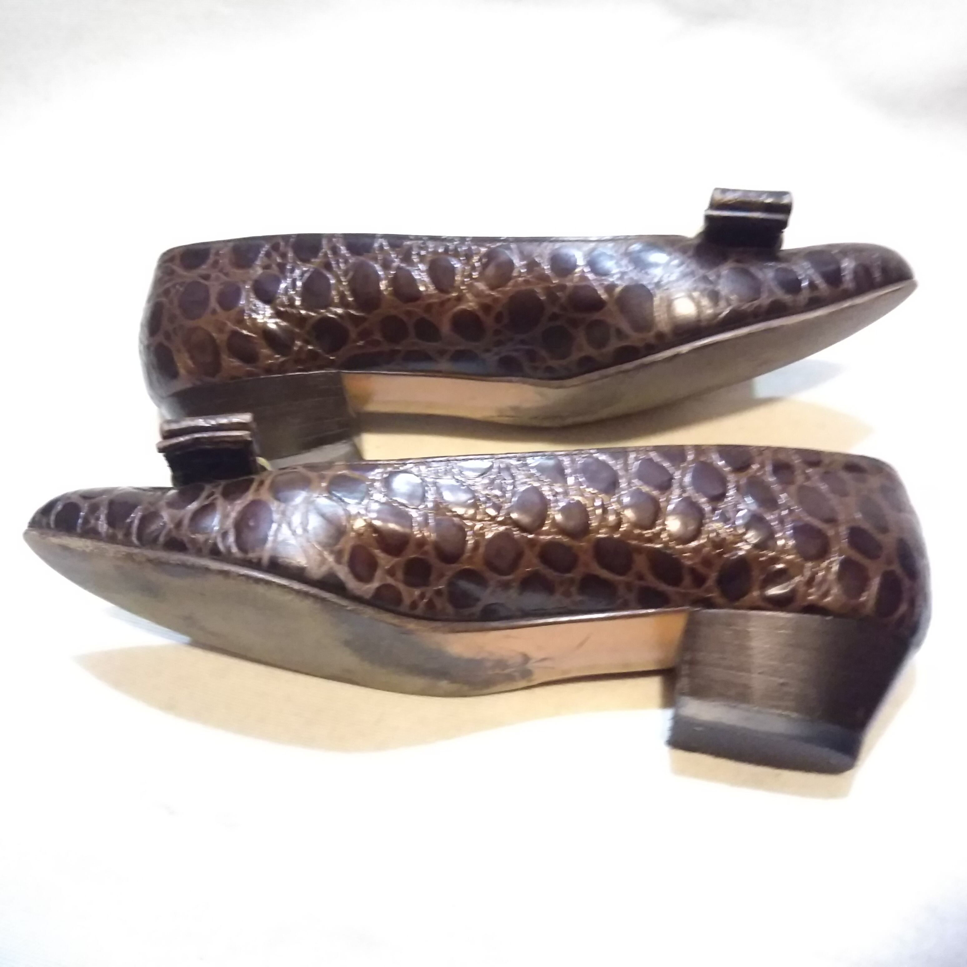 フェラガモ パンプス 焦げ茶色 リボン 型押し Salvatore Ferragamo