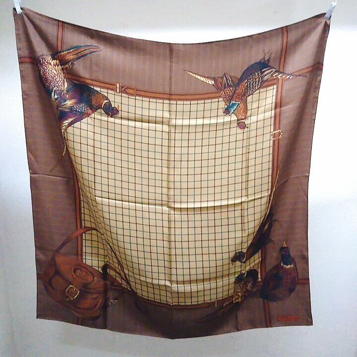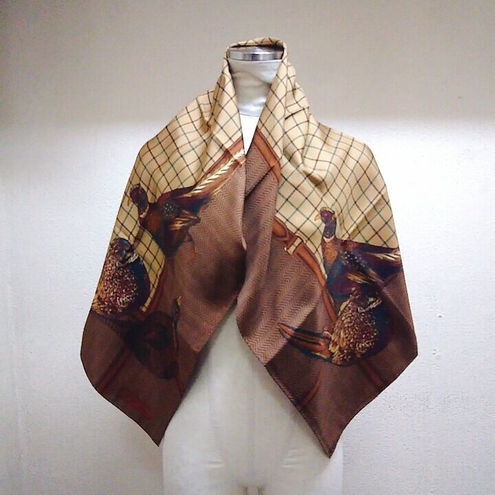 ラルフローレンのスカーフです。色は焦げ茶色です。鴨柄、カバン柄が施されたデザインです。