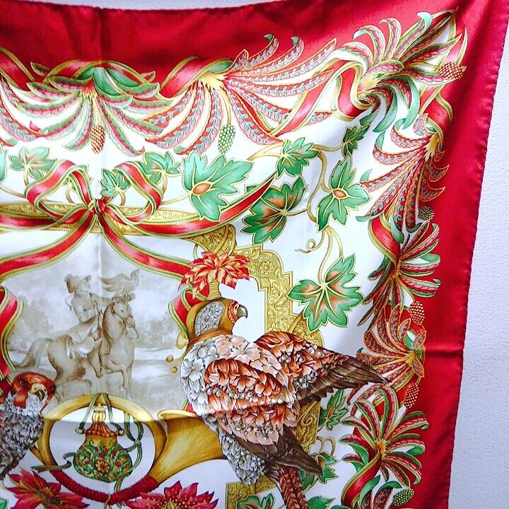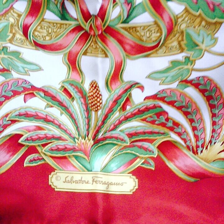 フェラガモ スカーフ 赤色 花柄 鳥柄 Salvatore Ferragamo