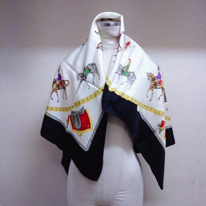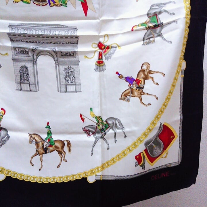 セリーヌのスカーフです。色は白色、黒色です。馬柄が施されたデザインです。