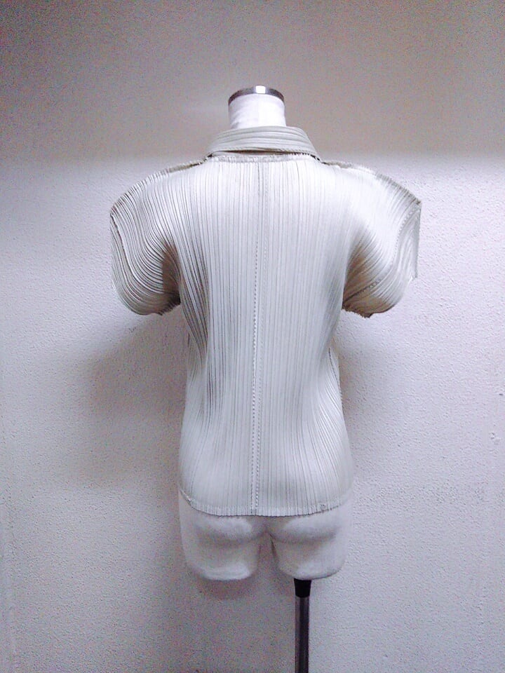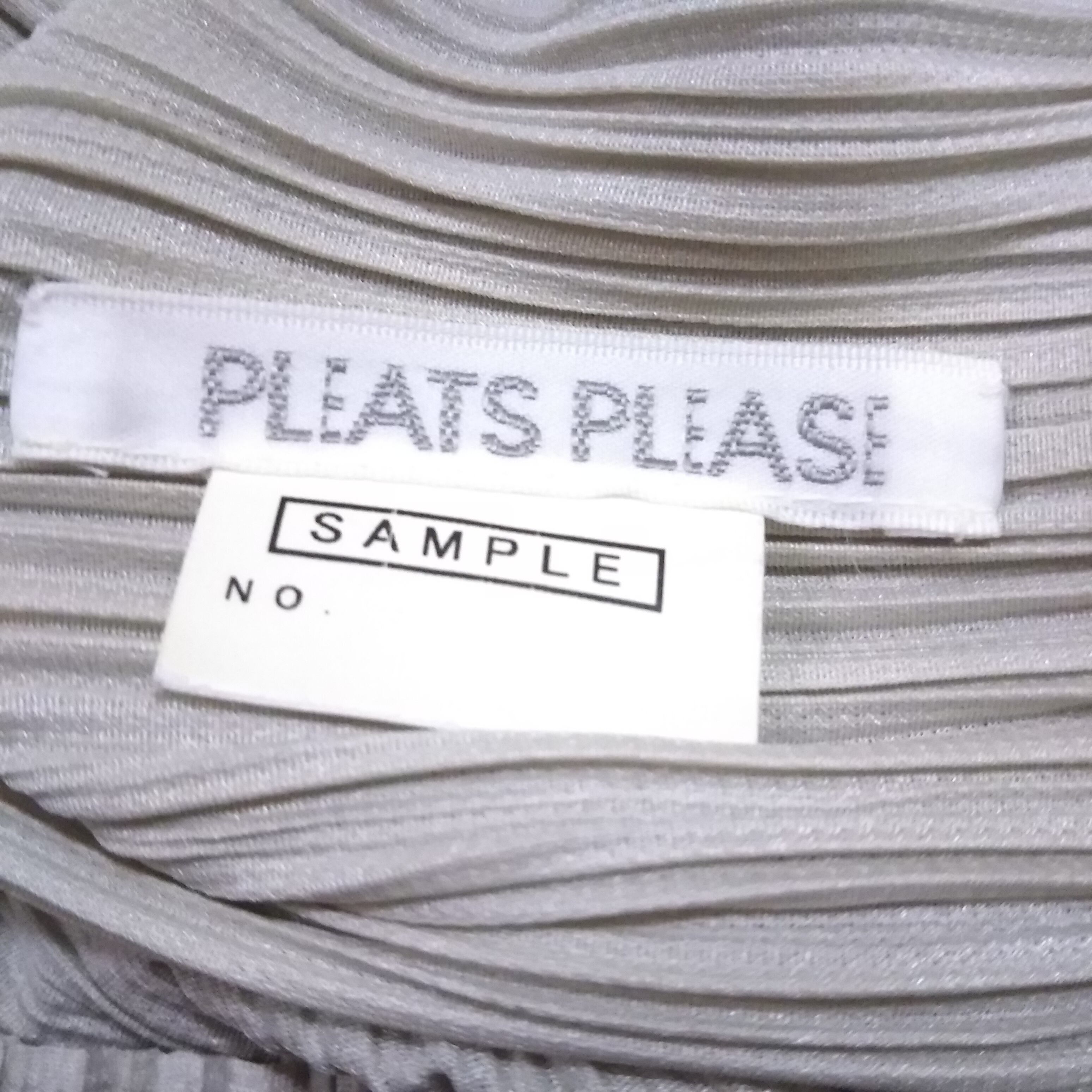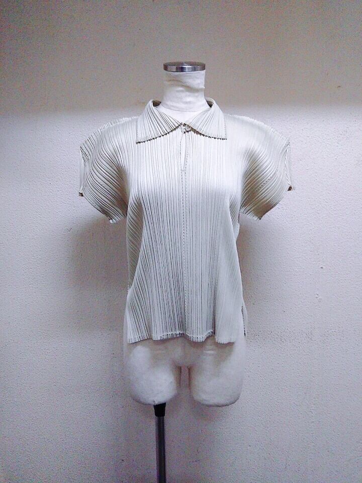 イッセイミヤケ プリーツプリーズの半袖トップスです。色はグレージュ色です。