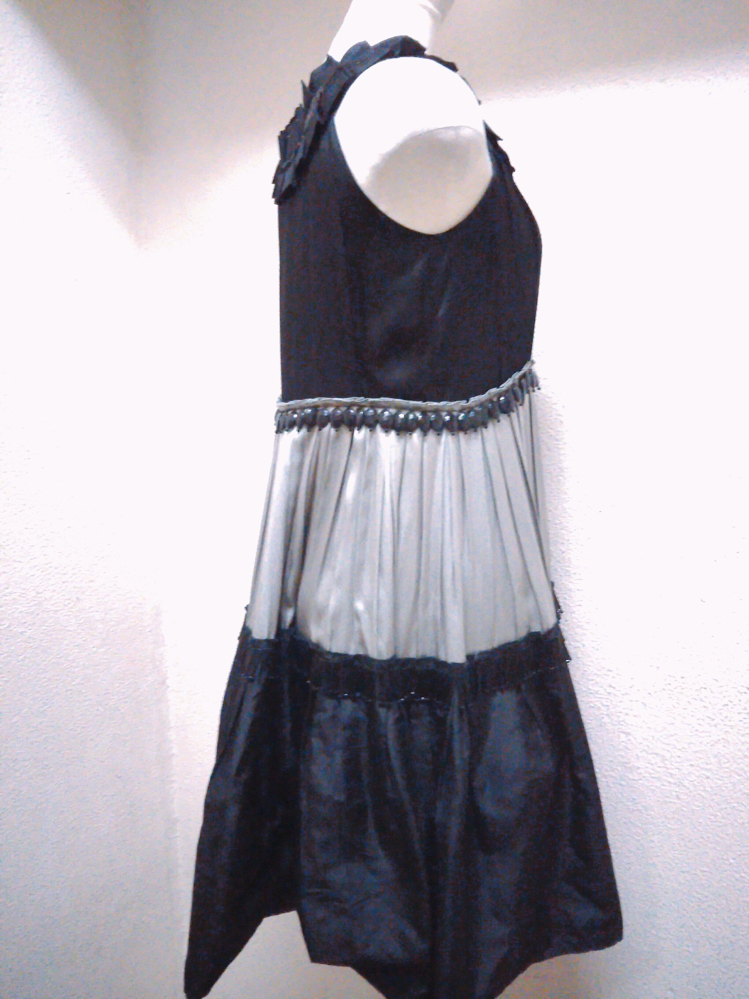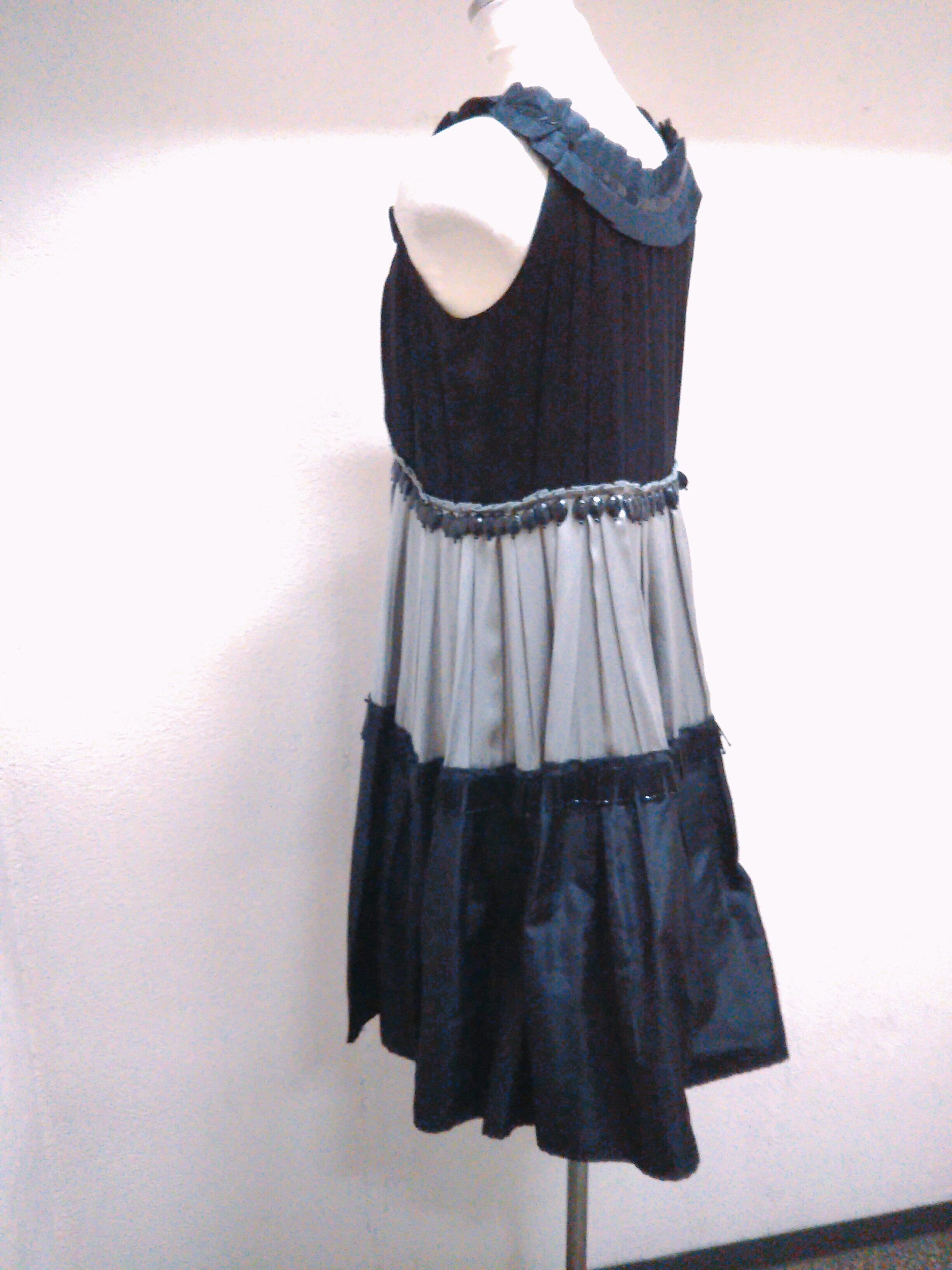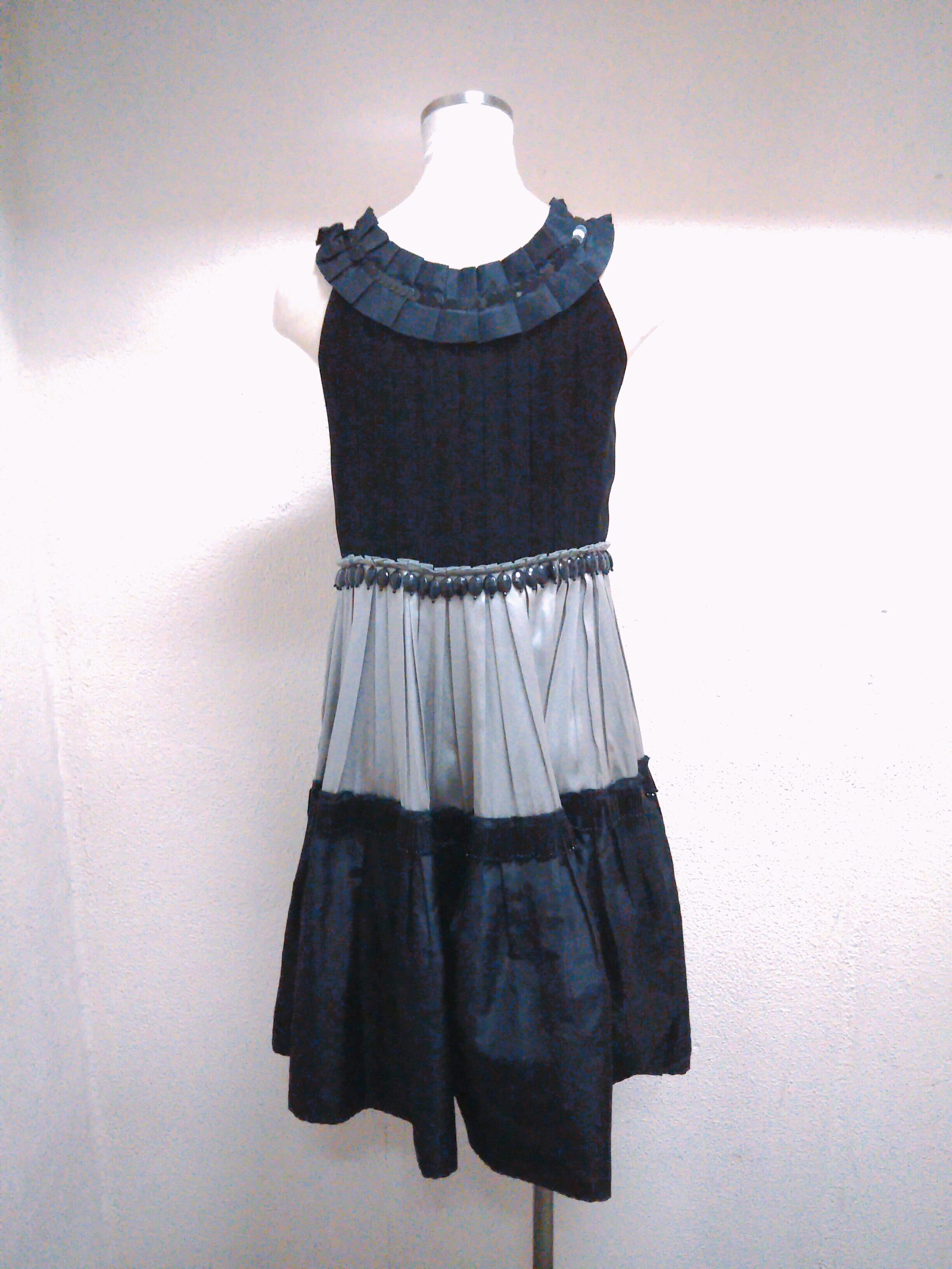 モスキーノのノースリーブワンピースです。色は黒色、グレー色です。ビーズ、スパンコールが施されたデザインです。