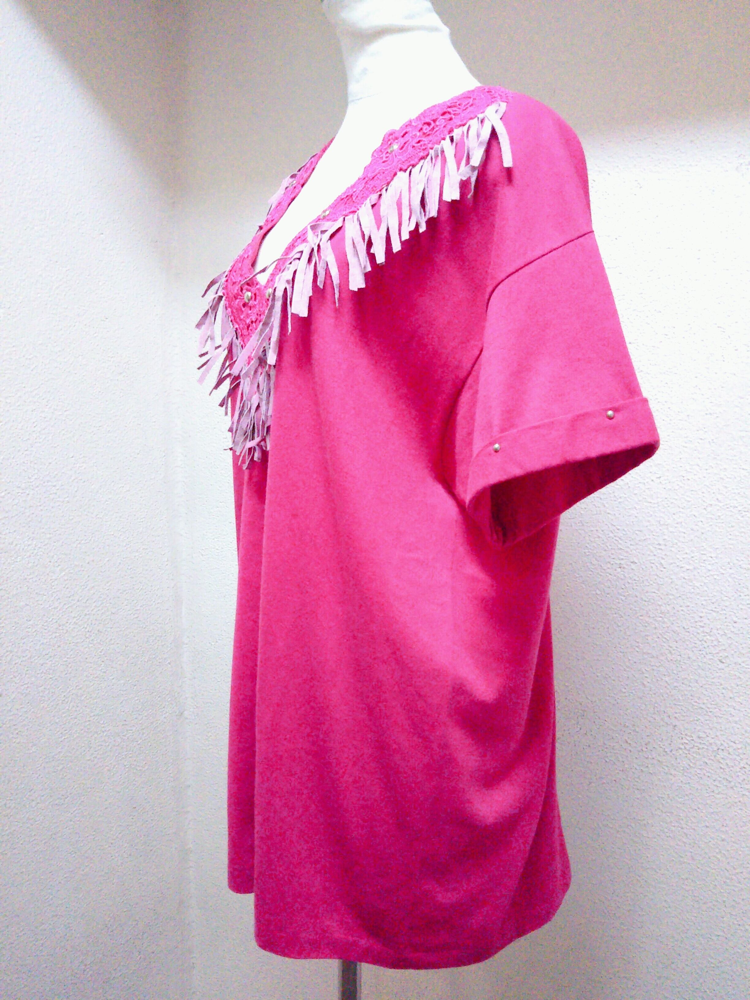 USED 半袖Tシャツです。色はピンク色です。フリンジが施されたデザインです。