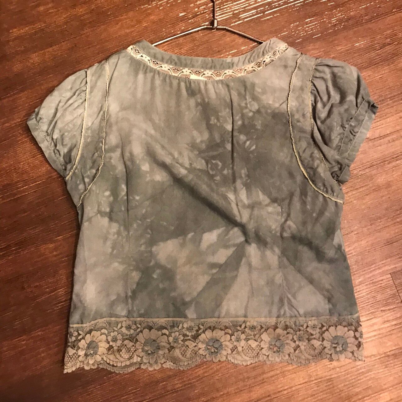 usedの半袖ブラウスです。色はブルーグレーでビンテージ調です。襟ぐり、裾にレース付