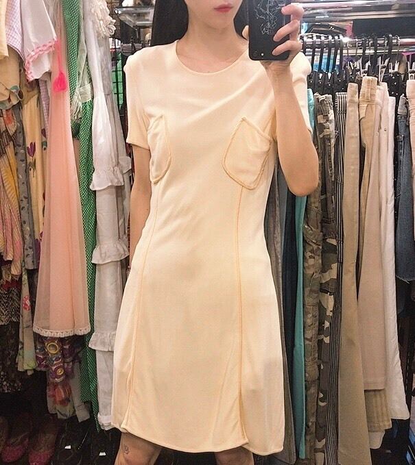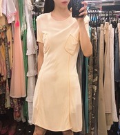 セリーヌの半袖ワンピースです。色はベージュ色です。シンプルな形に胸ポケットがポイントになっています。