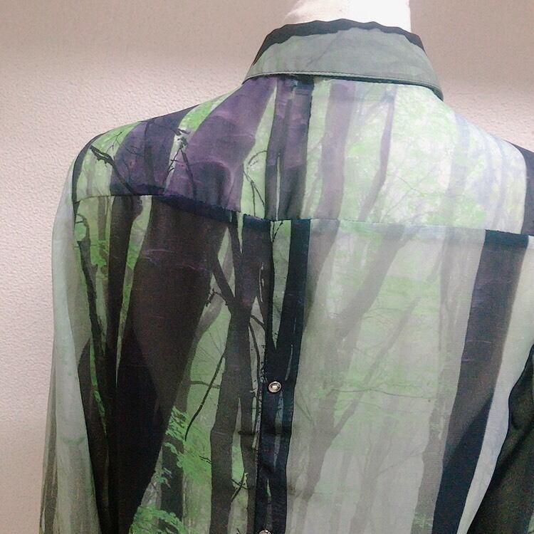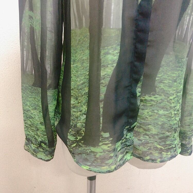 usedのシフォンブラウスです。色は黒×緑色系です。珍しい樹海プリントです。