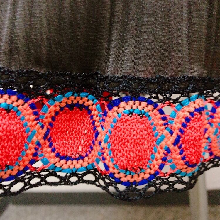 プリーツプリーズイッセイミヤケのプリーツスカートです。色は黒です。裾に赤いレース編みの飾りが付いたデザインです。