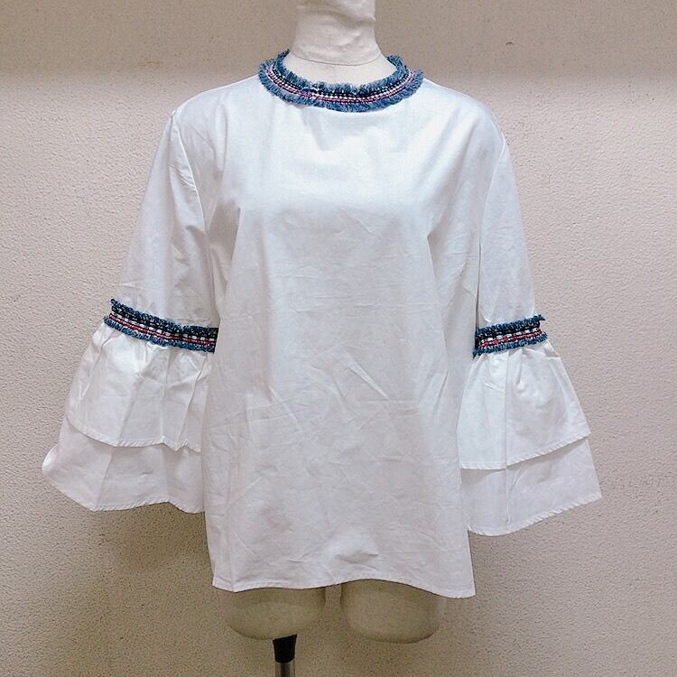 usedのフリル袖トップスです。色は白に青系のフリンジがついています。usedですがタグが付いたままの美品です。