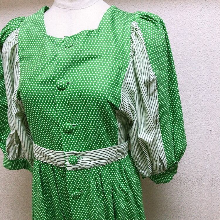 used パフスリーブワンピース 緑 ドット柄