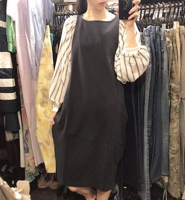 BONAPPETITの長袖ワンピースです。色は黒×白ベージュのストライプです。身頃がカットソー、袖がシャツ地になっています。