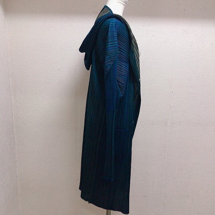イッセイミヤケの長袖カーディガンです。色はネイビーに裏がカーキです。フードのついたデザインです。
