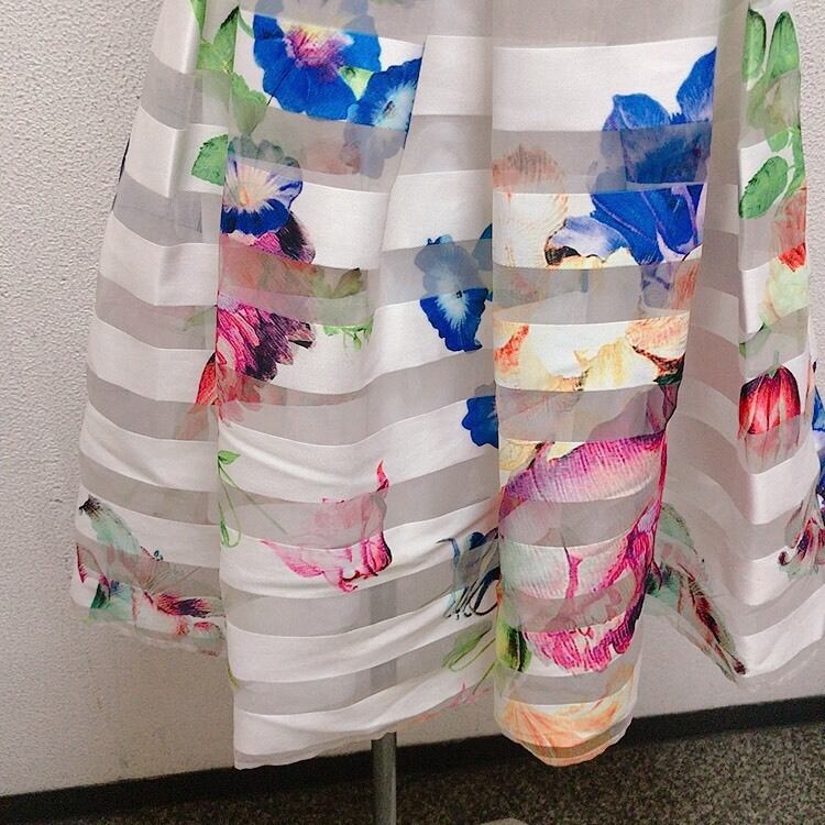 テッドベイカーのフレアスカートです。色は白のボーダー地に花柄のプリントです。