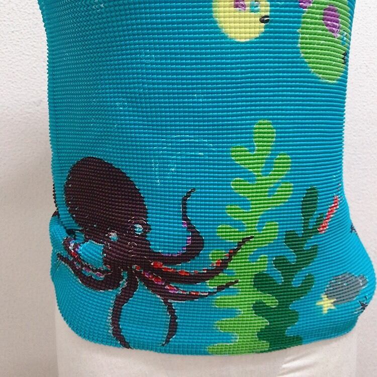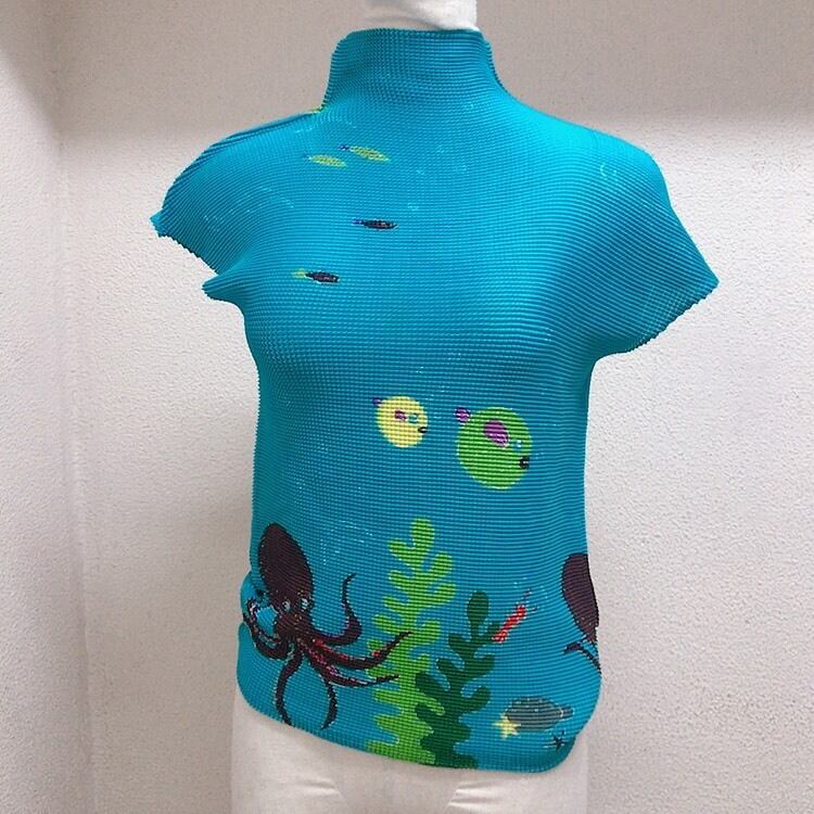 イッセイミヤケのフレンチスリーブトップスです。色は水色にタコやフグの海洋生物柄です。