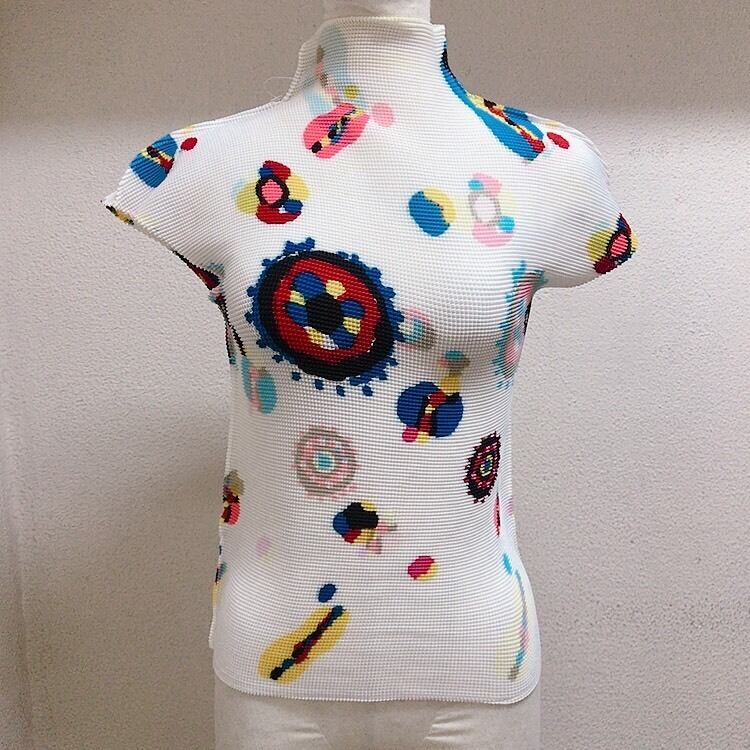 イッセイミヤケのフレンチスリーブトップスです。色は白に赤、青、黄色などの幾何柄です