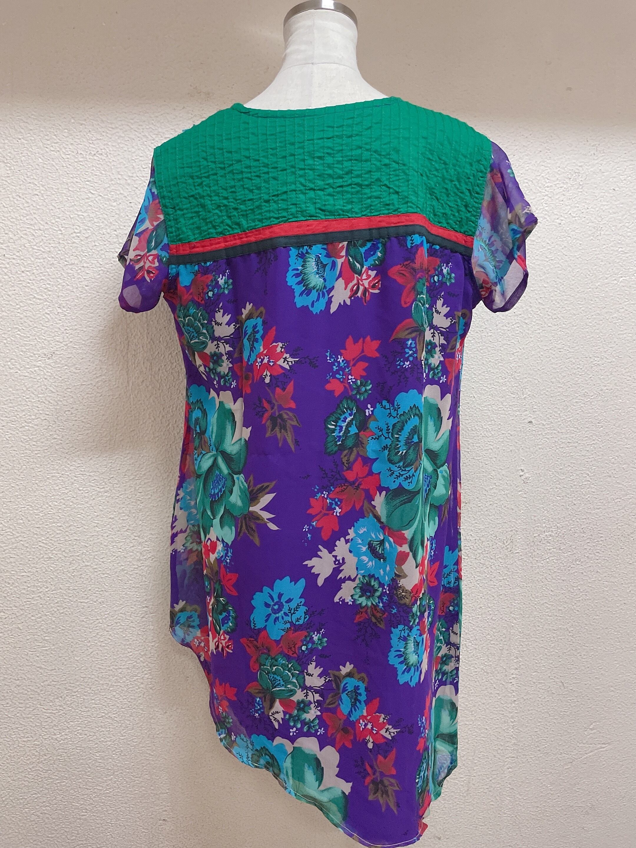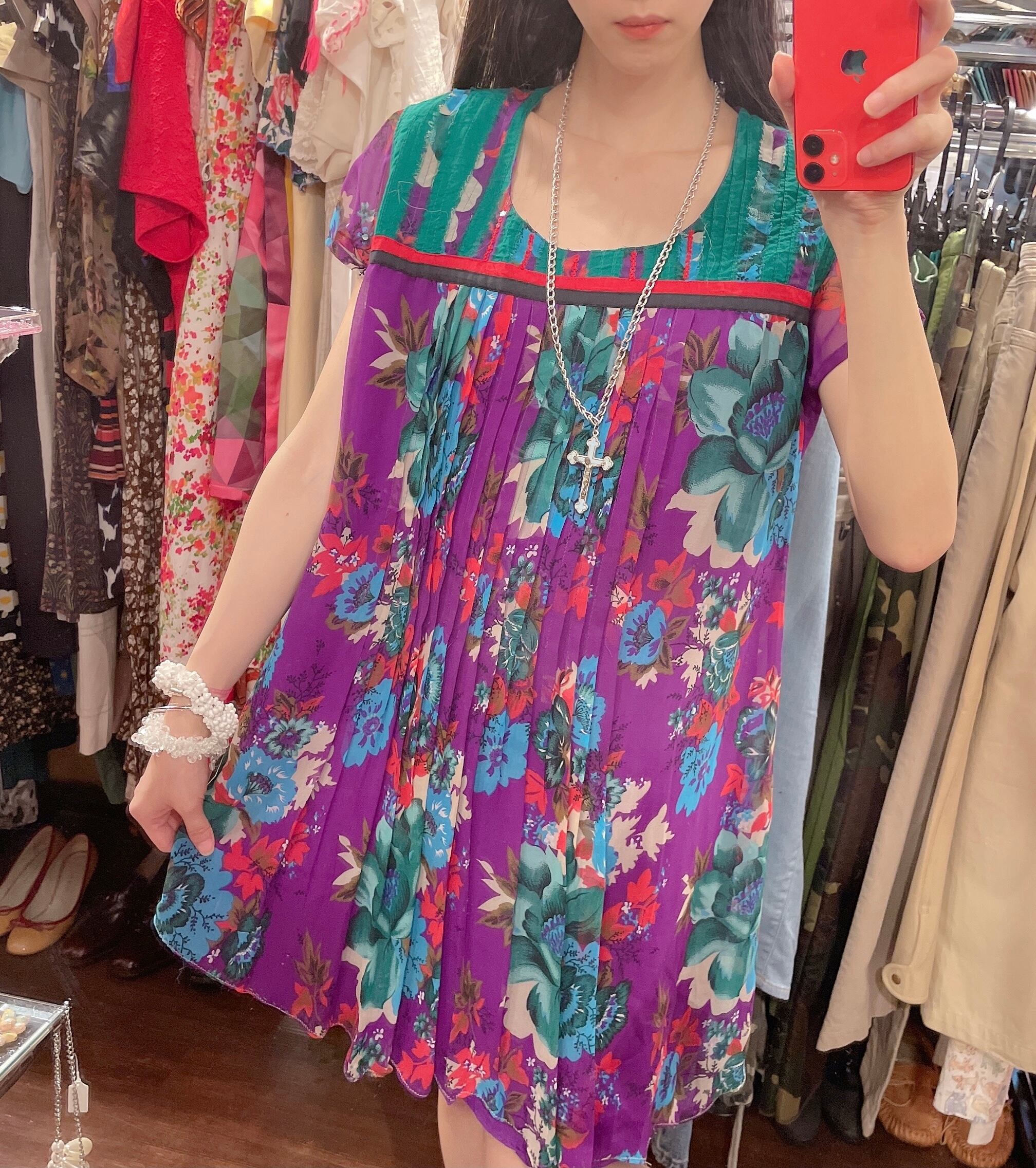 Usedの半袖ワンピース、チュニックです。色は紫ベースの花柄です。プリーツやピンタックなど凝ったディテールです。