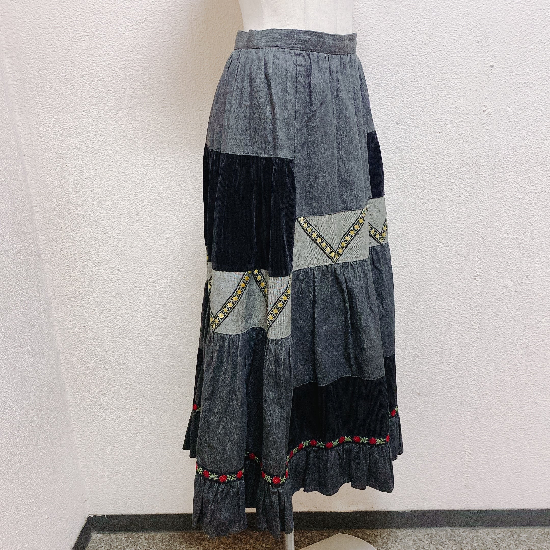 色はグレー、黒色です。パッチワーク風のデニムスカートです。
