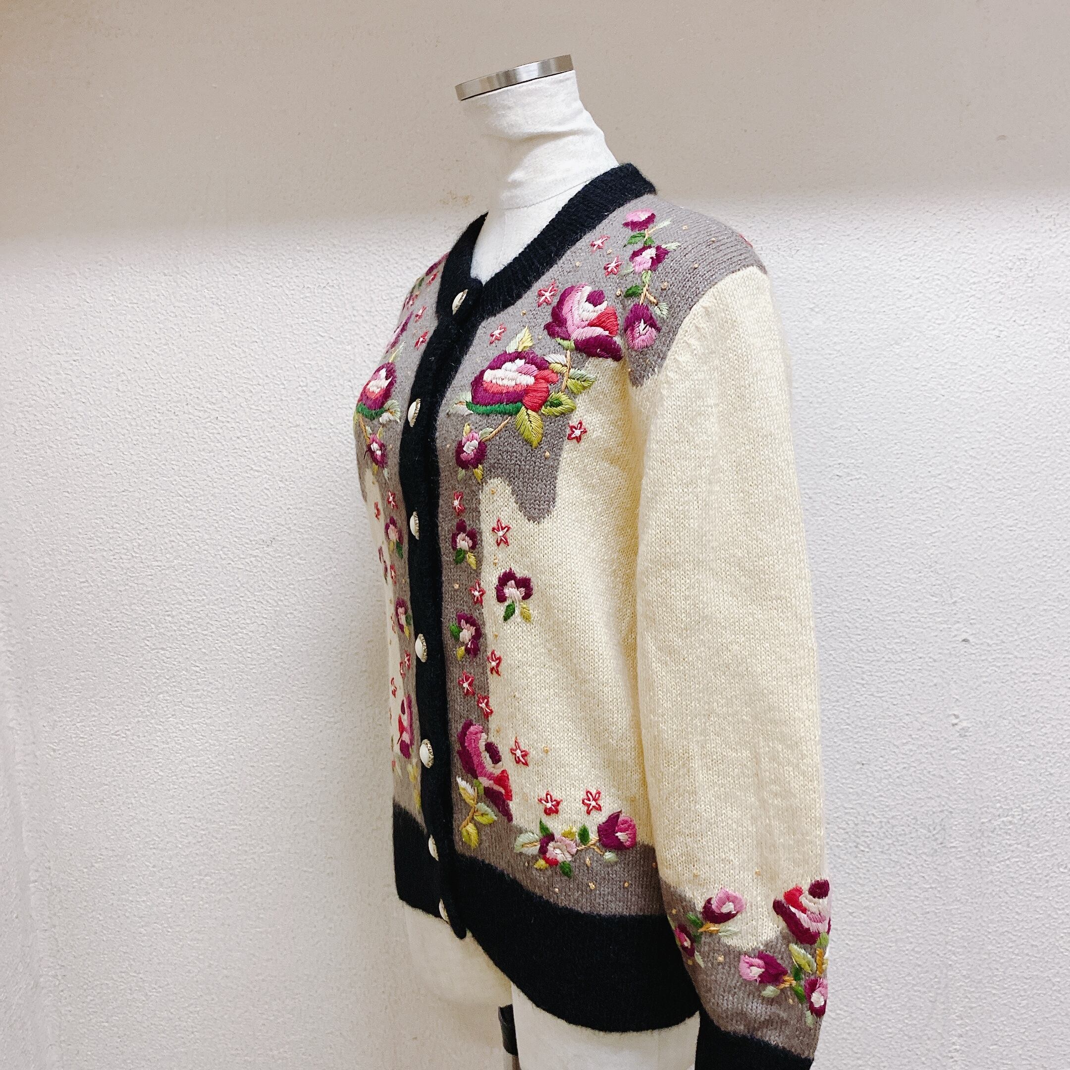 ヴィンテージ ニットカーディガン 白 花柄 刺繍 vintage knit cardigan