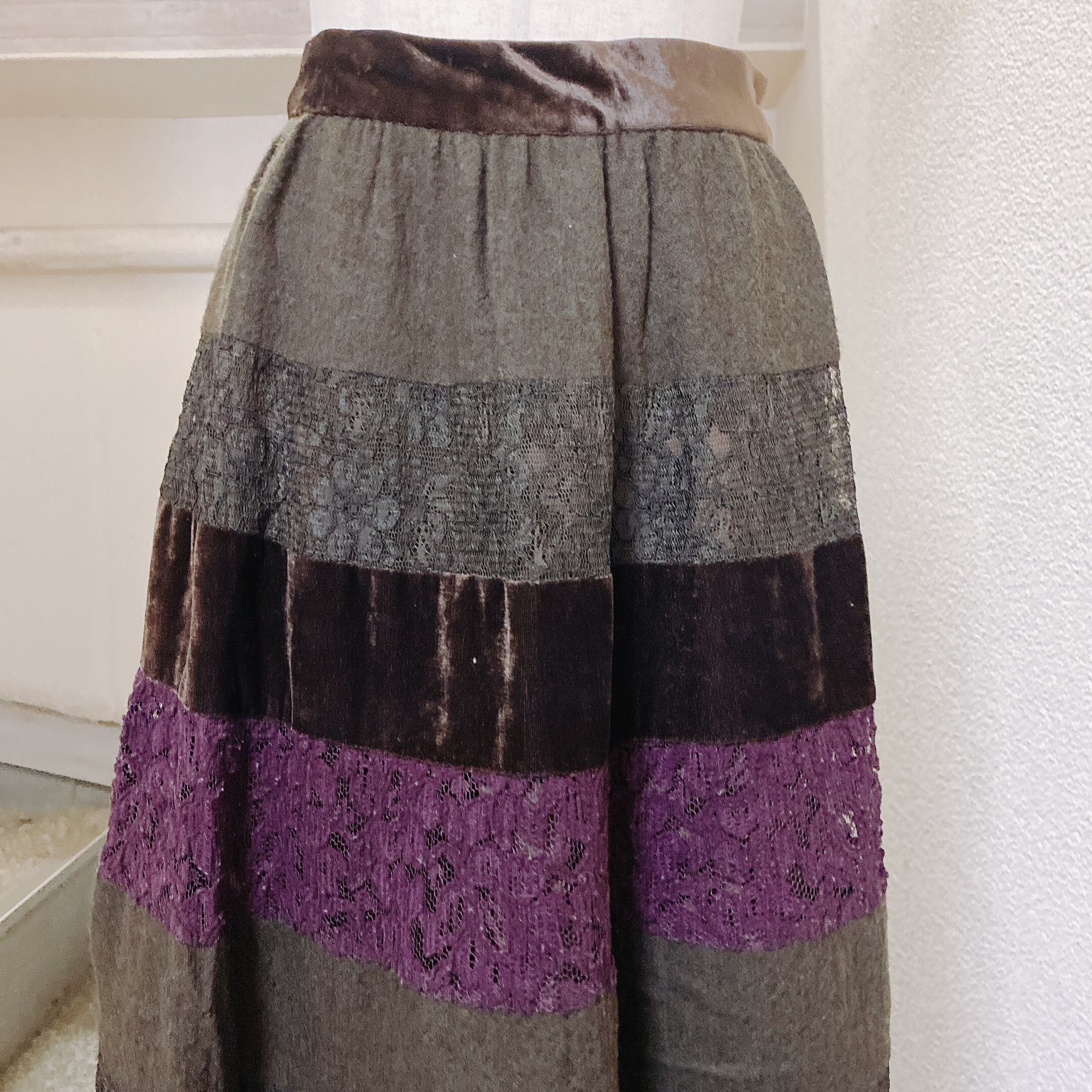ノンノンドール ロングスカート カーキ 紫 レース ベロア non non dorl ムッシュ榊