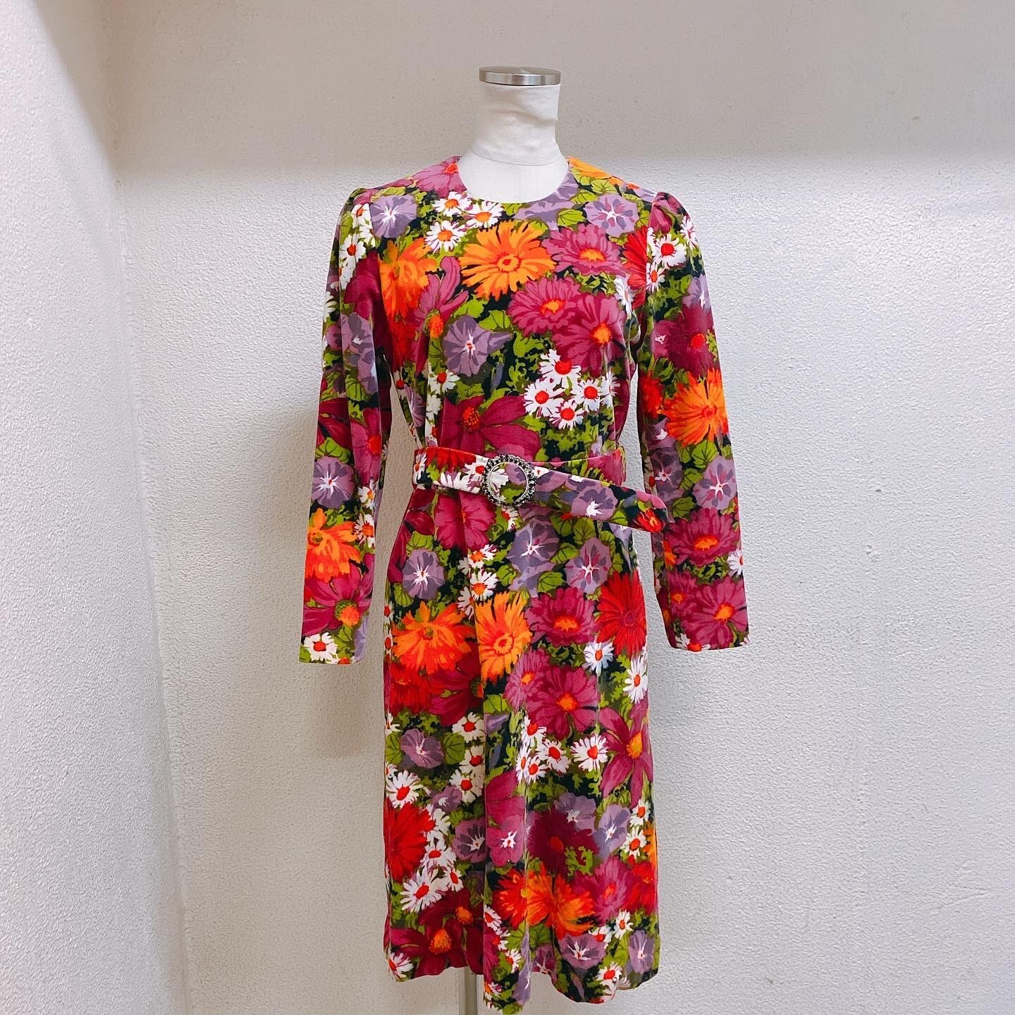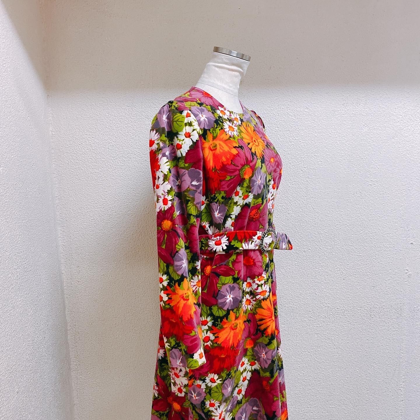 ヴィンテージ 長袖ワンピース ベロア 花柄 赤 紫 オレンジ vintage onepiece