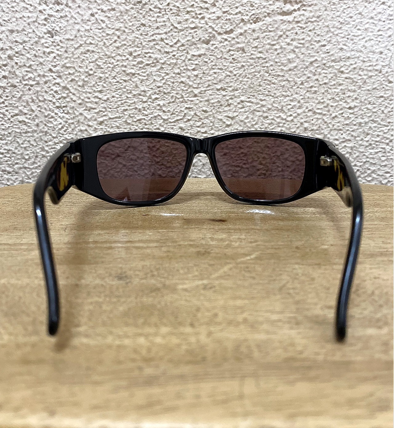 お色は縁がブラック、レンズは薄いパープルで、サイドがレオパード柄です。
