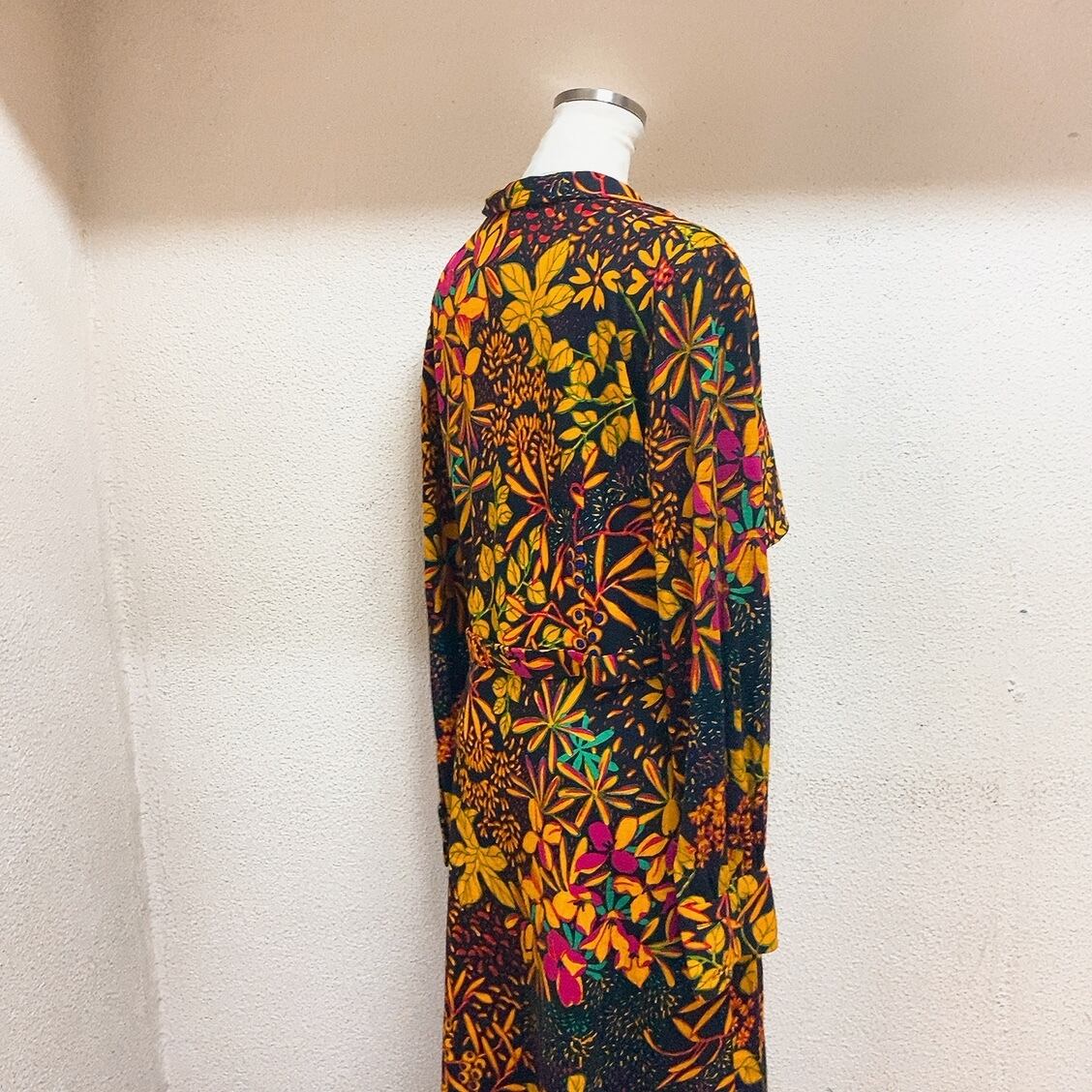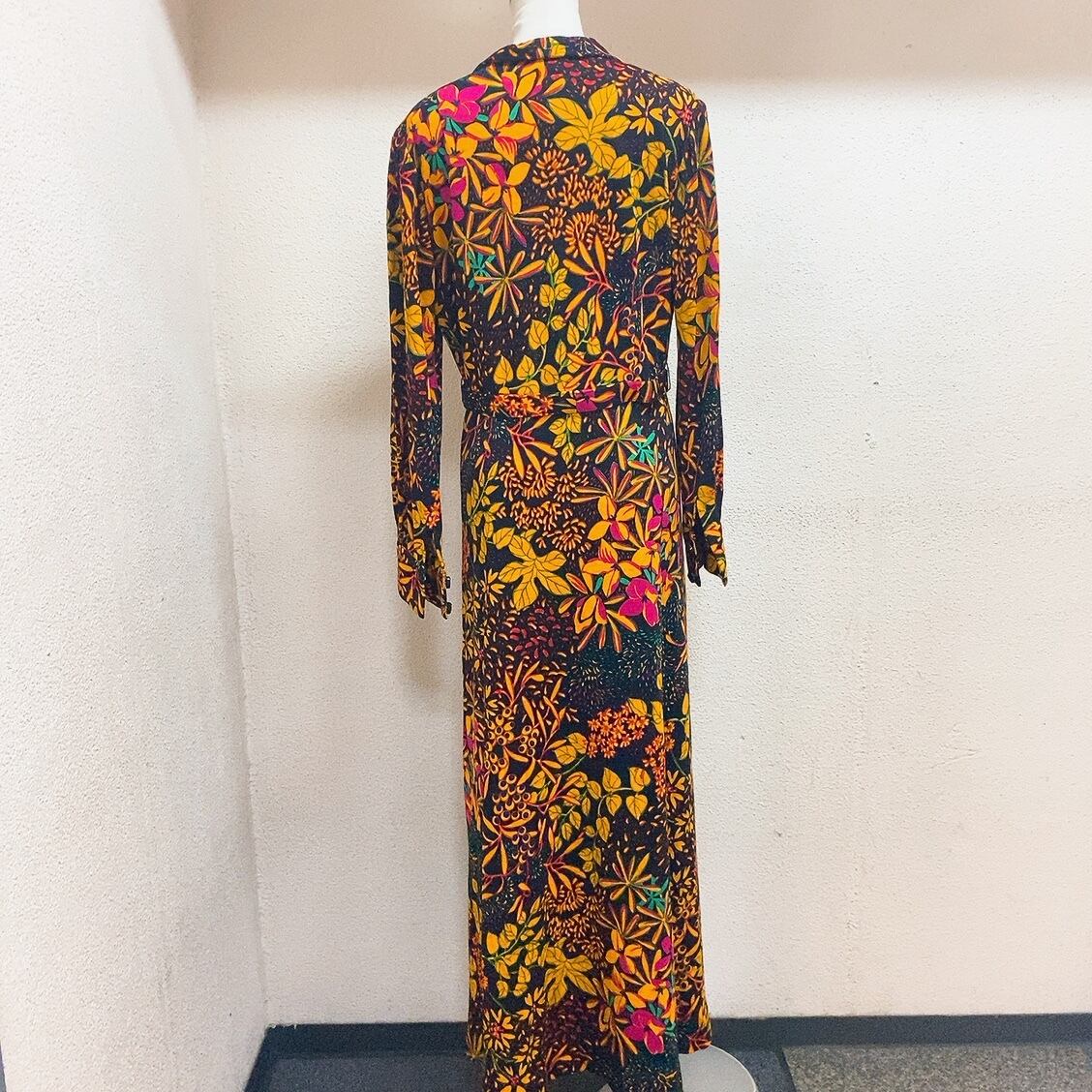 ヴィンテージ 長袖ワンピース 黒 オレンジ 黄色 花柄 vintage onepiece