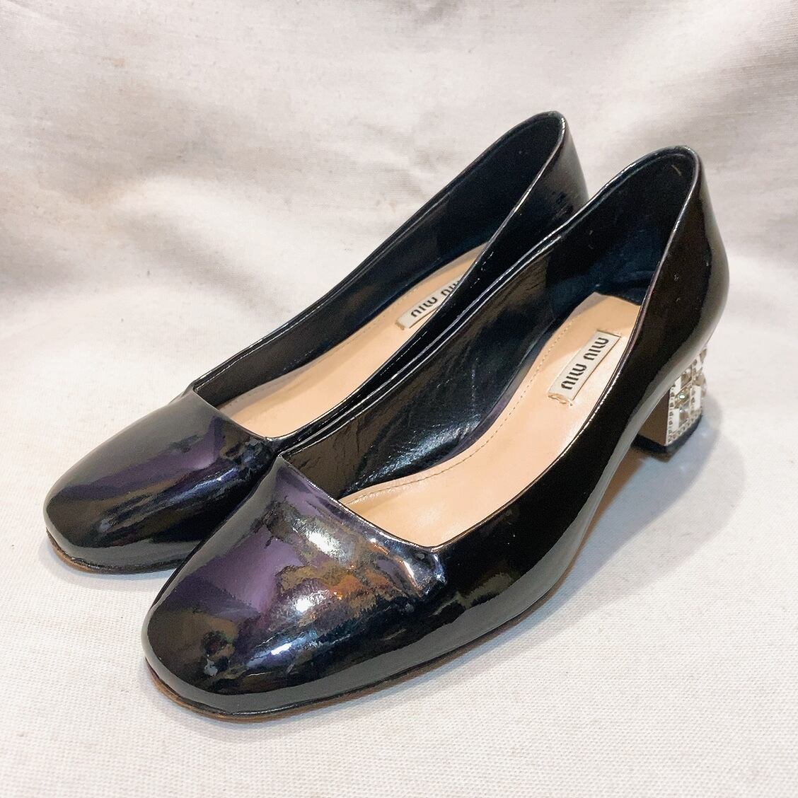 ミュウミュウ パンプス 黒 エナメル ラインストーン miumiu