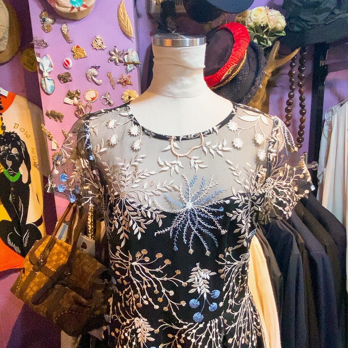 ヴィンテージ 半袖ワンピース 黒 花柄刺繍 シースルー vintage onepiece