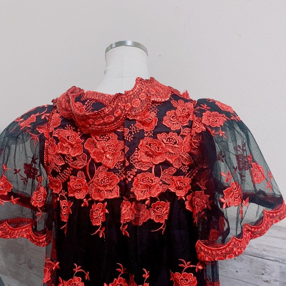 ヴィンテージ 半袖ワンピース 黒 赤 レース 花柄 刺繍 ドレス vintage onepiece