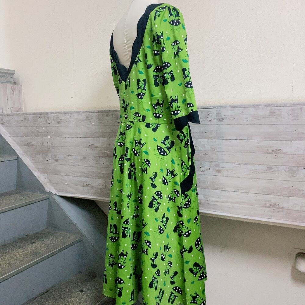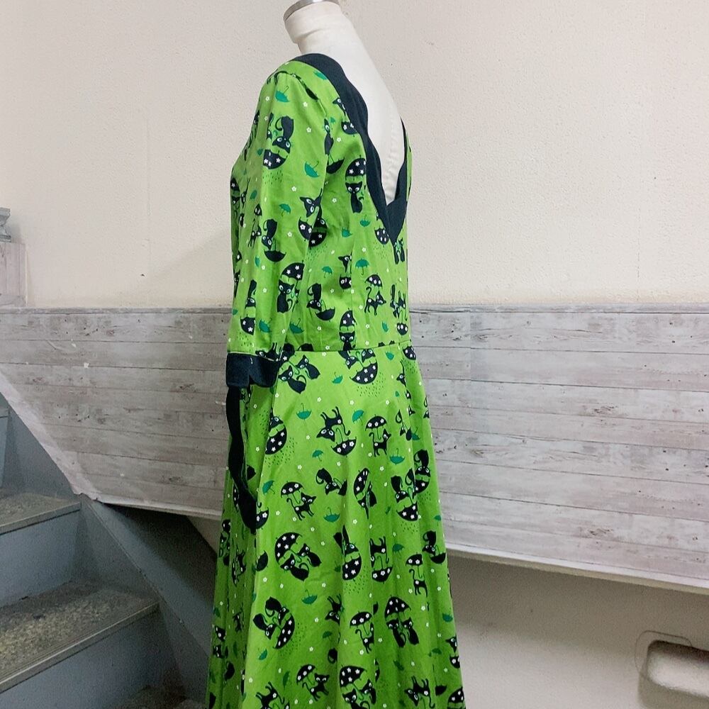 ヴィンテージ 半袖ワンピース 黄緑色 猫柄 vintage onepiece