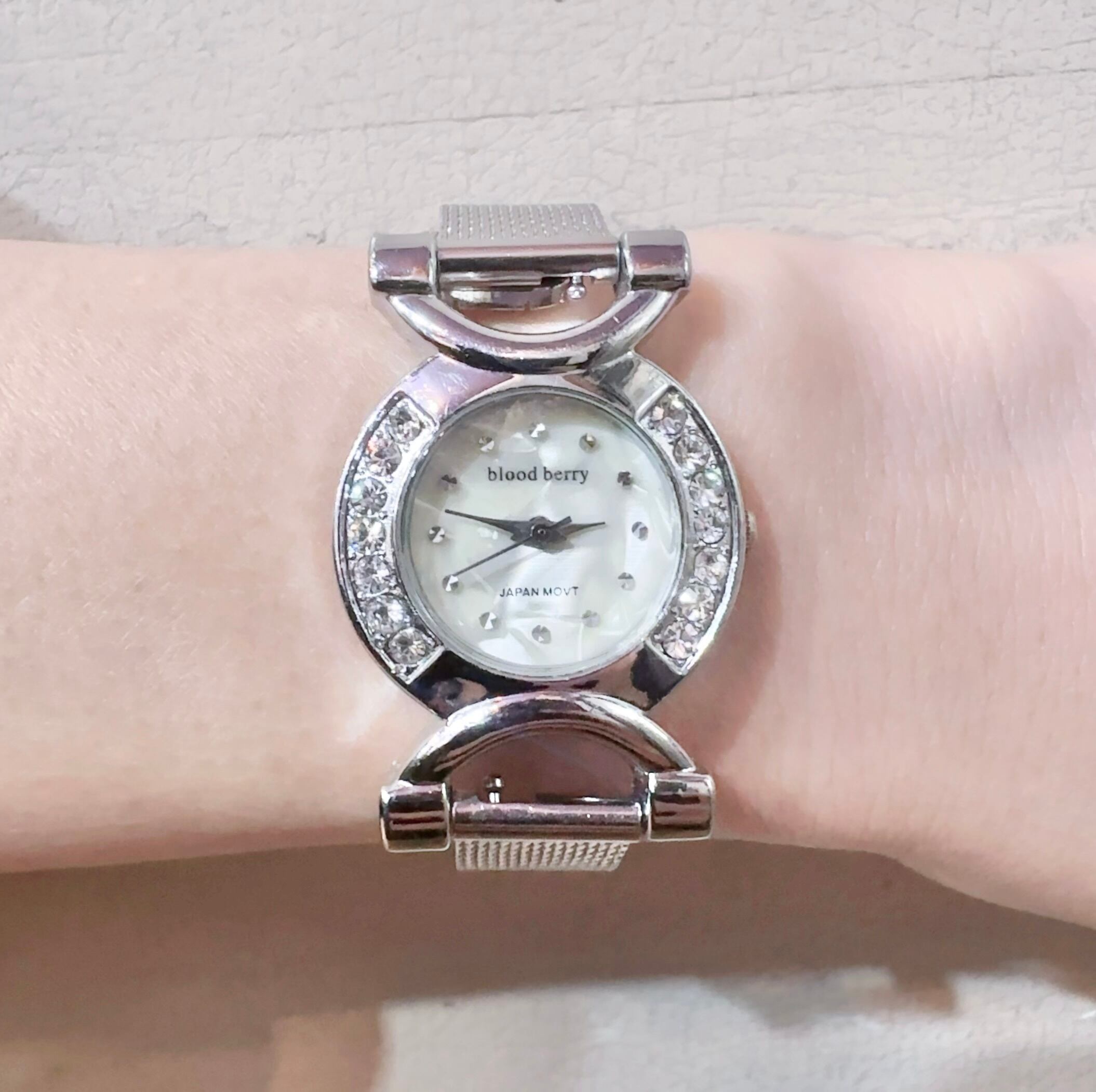 文字盤はシェル、文字盤周りにはビジュー付きです。